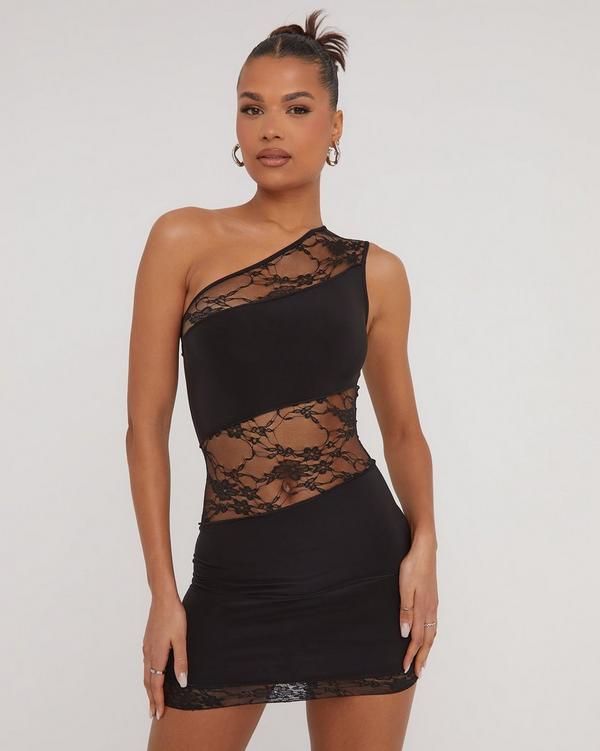 Product id: One shoulder mesh top dress with lace inset